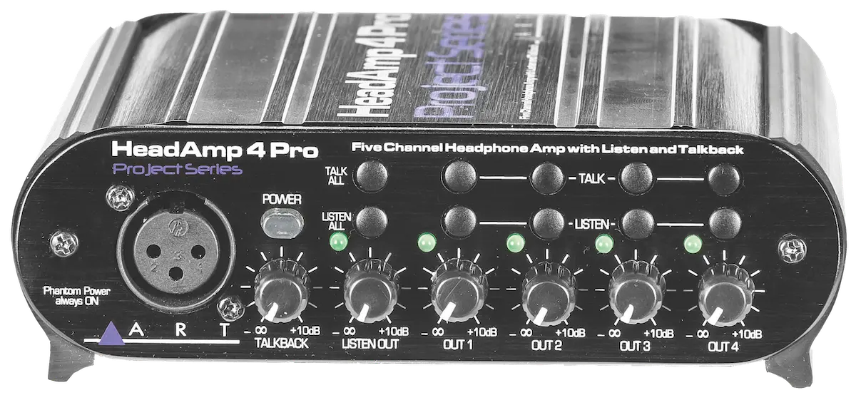 Packing as many features as possible into the small format chassis, the HeadAmp4Pro has five stereo headphone outs, each with their own volume control. A separate footswitchable XLR input (with phantom power) allows instant talkback to any one, or all of the connected headphones. Input matrix allows the listener to audition any or all auxiliary inputs for maximum versatility.