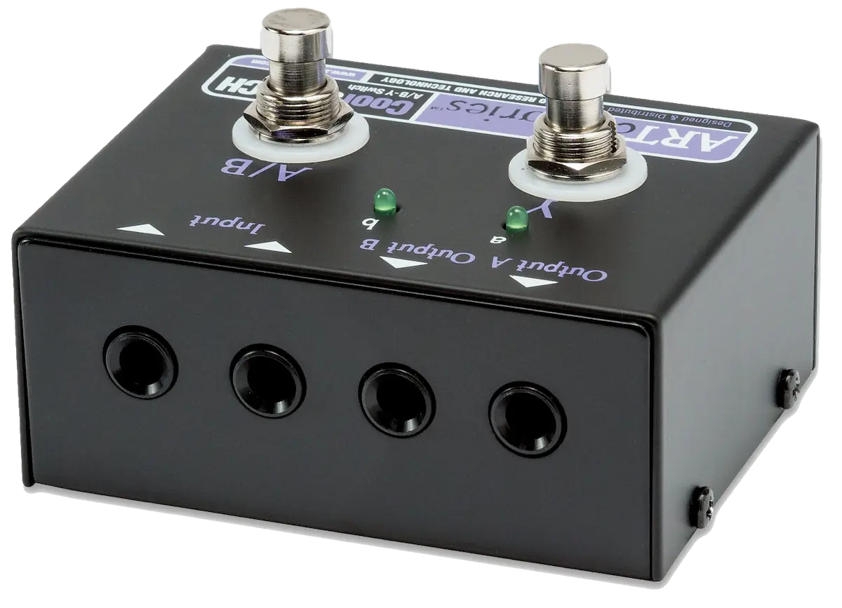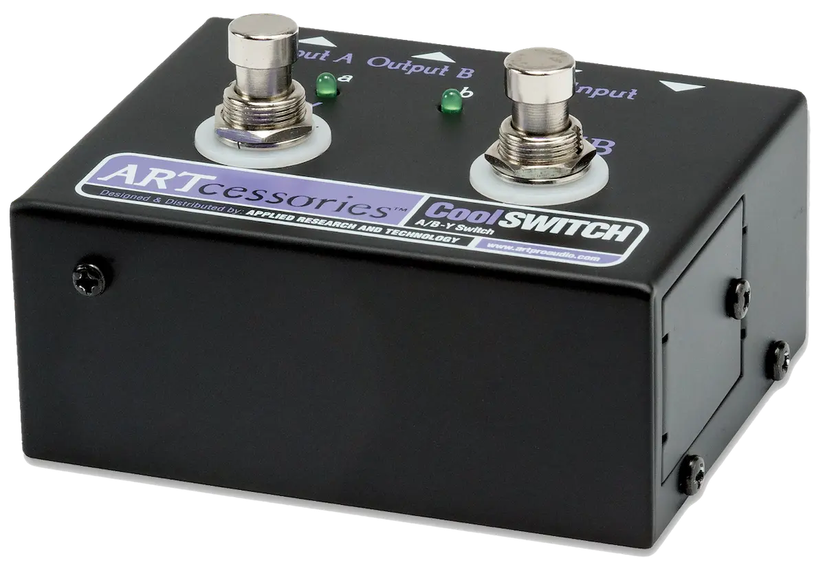 A/B-Y switching works two ways. It lets you switch a common source signal (guitar, bass or keyboard) between two amplifiers or amp channels. Or conversely, it lets you switch two source signals (ie, two different guitars) into the same amplifier. A good quality A/B-Y switcher will also provide LEDs or other indicators to show whether A, B or Y routing is in effect. The Y routing combines both the A and B outputs in parallel so that two amplifiers can be driven at once. The CoolSWITCH provides full A/B-Y switching functionality, plus parallel Common in/out jacks.