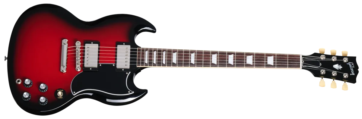 In 1961, the Les Paul™ model was put on hiatus, and an all-new design evolved into what is today known as the SG™ or "solid guitar." The Gibson SG Standard '61 retains the styling of the original featuring a Slim Taper™ mahogany neck and a bound rosewood fingerboard. The mahogany body features deeply sculpted body scarfing, a 5-ply teardrop pickguard, and a 22nd-fret neck joint. The nickel-plated hardware includes a classic-style Tune-O-Matic™ bridge and Keystone tuners. The pickups are 60s Burstbucker™ humbuckers™ for a classic voice with added power and top end. Controls feature audio taper potentiometers and Orange Drop® capacitors. A hardshell case is also included.