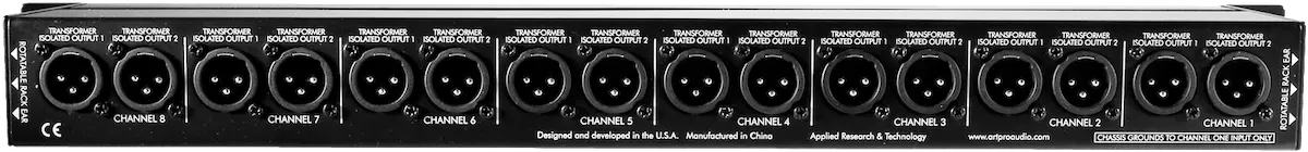 Each channel provides one XLR input, one XLR direct output with two additional transformer isolated XLR outputs for a total of 3 balanced outputs from each single microphone input signal.