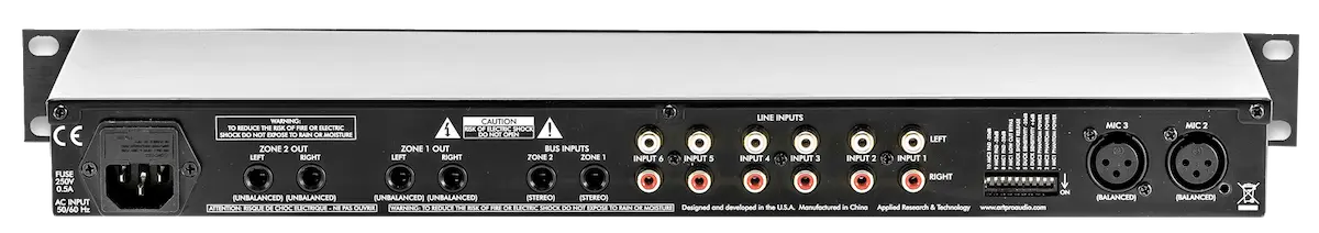 The first channel can be used to control, via a front-panel switch, a ducking feature for all other channels making it an ideal solution for paging systems. All six channels can accept unbalanced stereo line-level signals. 48v phantom power can be independently assigned for each mic channel. Each channel has independent level controls and can be independently routed to either zone output, both or neither. Separate level, bass and treble controls adjust the sound of each zone output. Two bus inputs allow patching of multiple units when more input channels are needed.