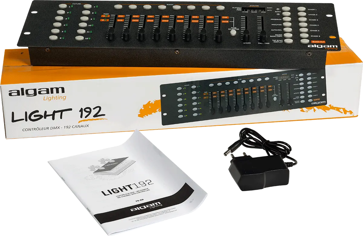 The LIGHT 192 is a DMX console for personalized remote control of your led projectors, moving heads, lasers or smoke machines. With its 192 channels for controlling an installation of up to 12 fixtures, this DMX console lets you realize all your lighting ideas through its 16 available channels per fixture. A perfect ally for your parties, the LIGHT 192 also features 30 banks of 8 programmable scenes, for a total of 240 memorized scenes, 6 chase programs with adjustable speed and fade time, and 8 faders for precise control of your setting preferences. Finally, this console comes in a rack-mountable 19" format for perfect integration into your setup.
