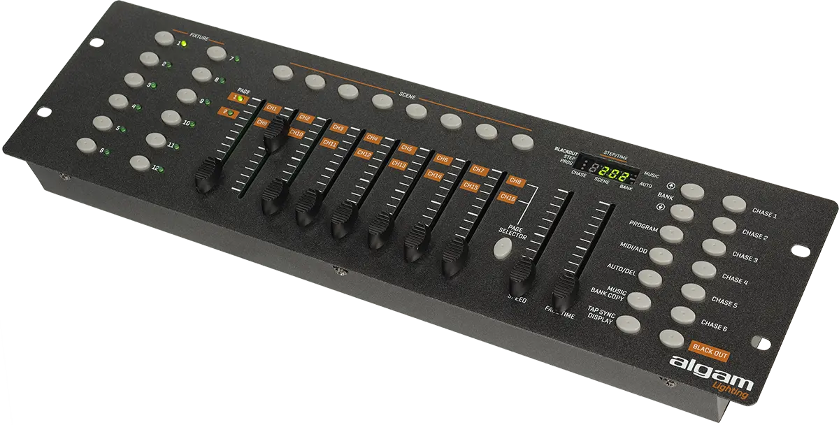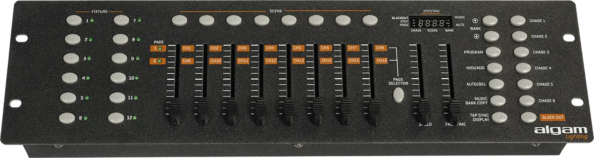 - Number of fader: 8 x 2 banks + 2 SPEED & FADETIME chase controls