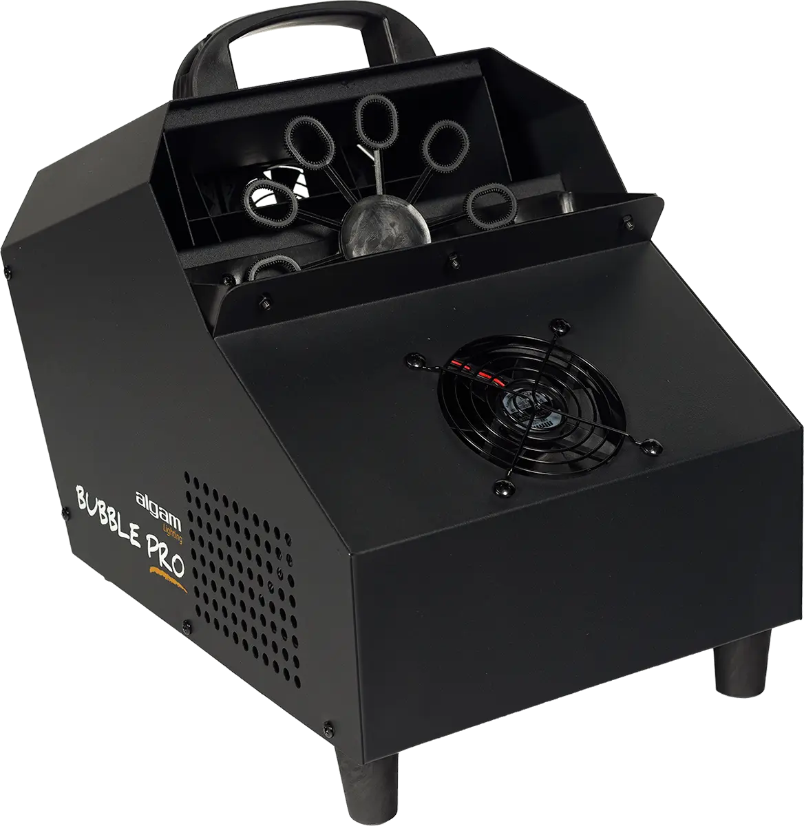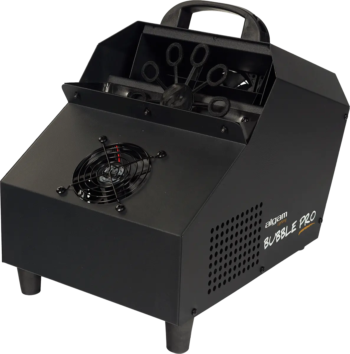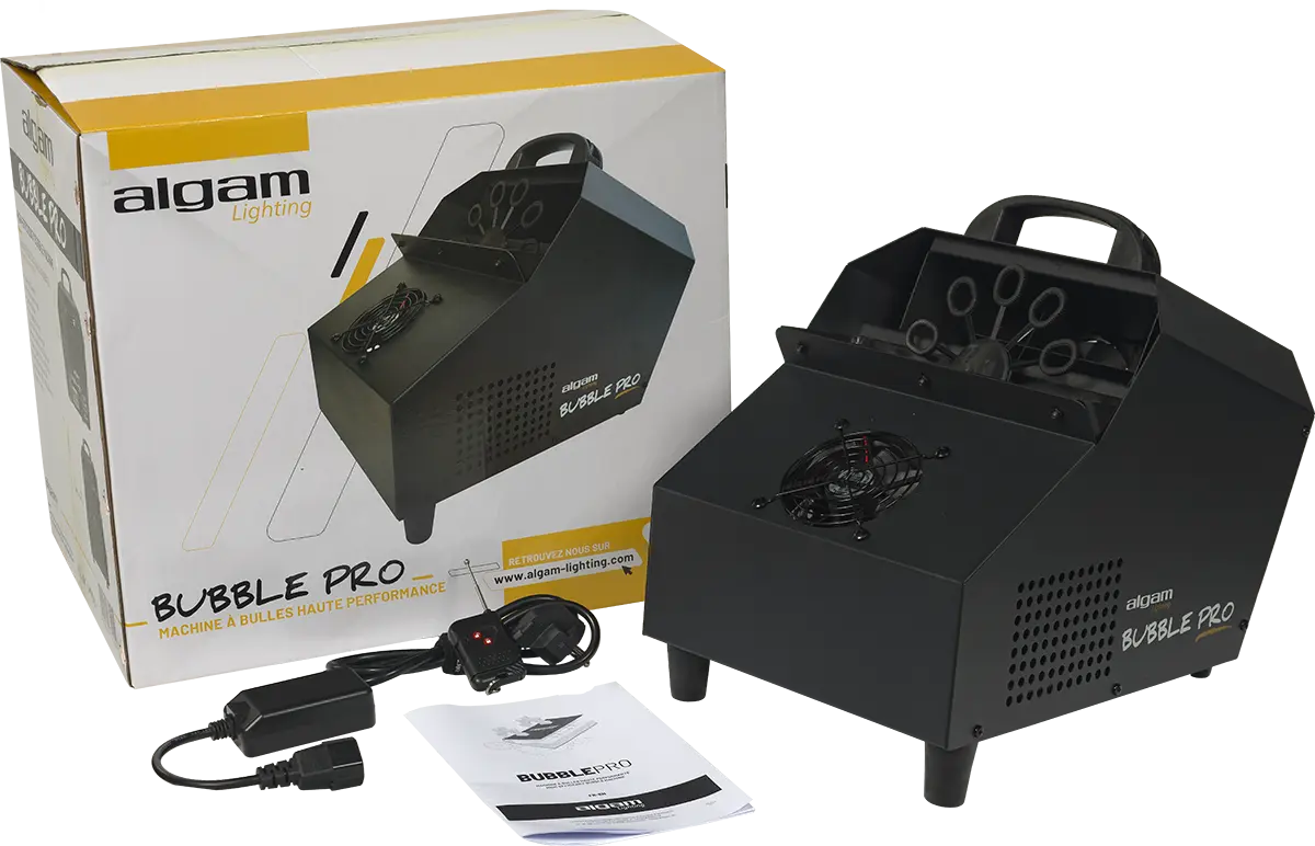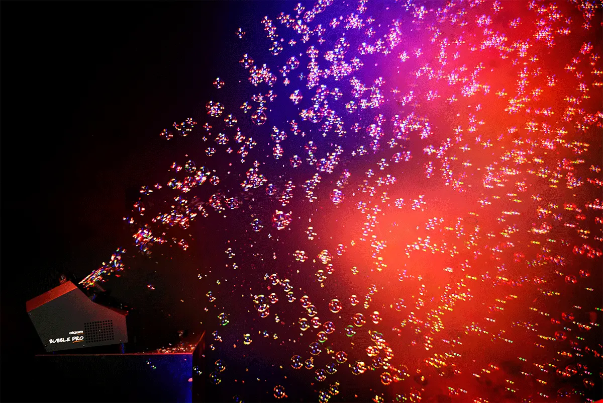The Bubble Pro is the perfect device for creating lively and enchanting atmosphere at various events, such as birthdays, parties, and corporate celebrations. This easy-to-use equipment requires only a soap-based bubble liquid to produce a remarkable volume of bubbles for an extended period. With a liquid flow rate of over 2 liters per hour, thanks to 2 fans blowing through a wheel of 10 rods rotating at 45 rpm, the Bubble Pro can generate a captivating cloud of bubbles that will fascinate everyone for up to 20 minutes with its 0.75-liter tank. Additionally, a third fan positioned at the front blows upwards, ensuring that the bubbles ascend flawlessly into the air, creating a truly magical effect. Whether it's a trade fair or a private celebration, the Bubble Pro iS an essential tool for creating an unforgettable experience.