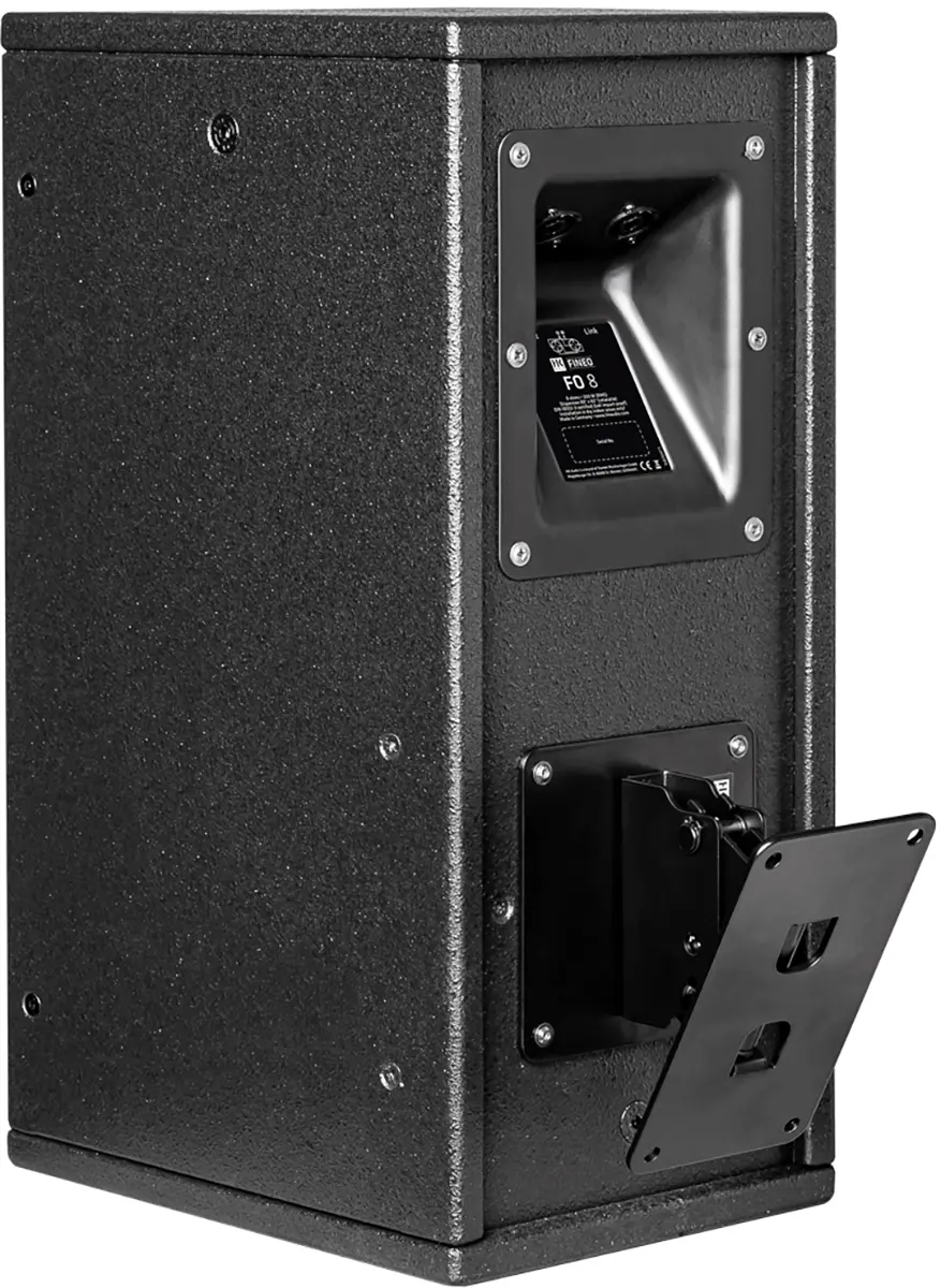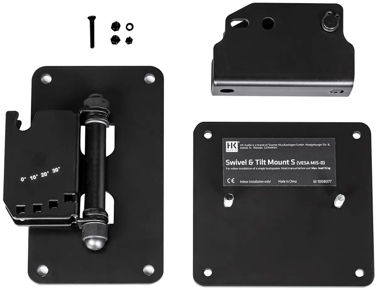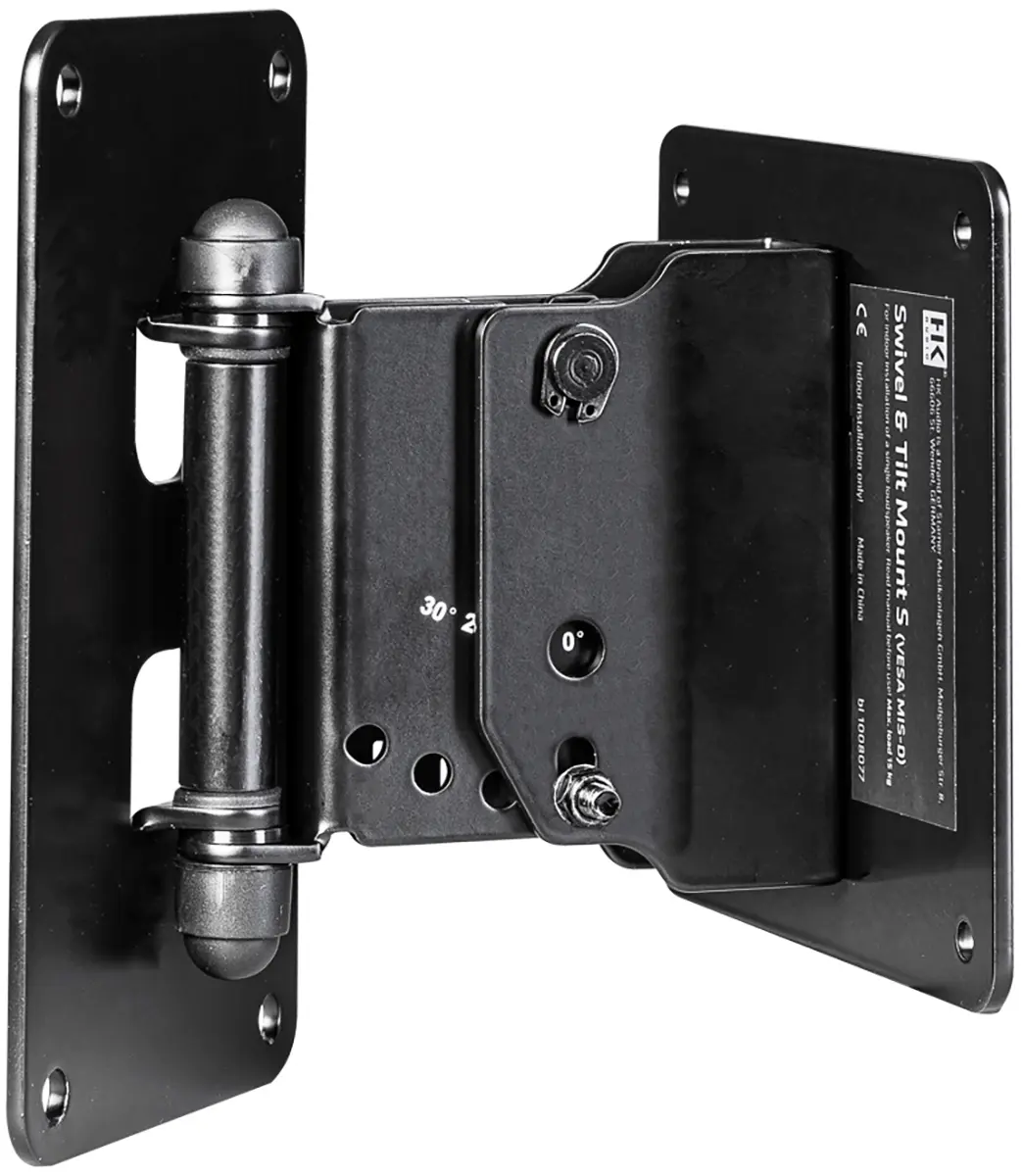 The swivel and tilt wall mount S (VESA MIS-D) can be used to mount a FO5, FO 8 or FO10 speaker on a wall. Together with the swivel and tilt bracket, the speaker can be continuously rotated horizontally and tilted vertically in 10° increments from 0° to 30°. The swivel and tilt wall mount S is attached via the VESA hole pattern (MIS-D) on the back of the speaker.