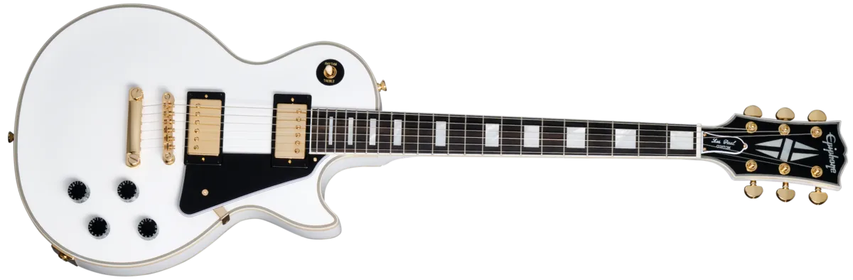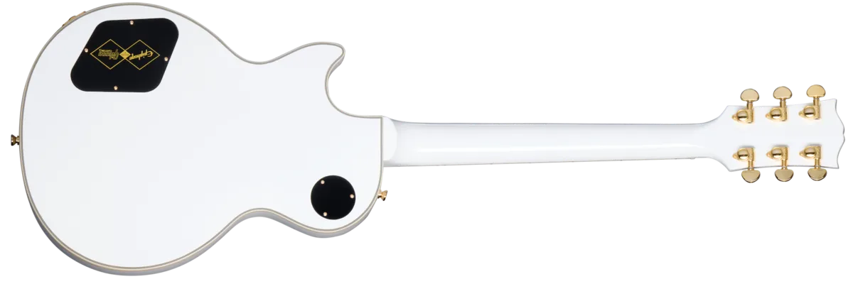 As part of the ongoing collaboration with Gibson TM Custom, Epiphone is proud to introduce the flagship Les Paul™ Custom to the Inspired by Gibson Custom lineup. Replete with all of the classy "tuxedo" appointments that the model is known for, this beautiful guitar has a one-piece mahogany neck with a 50s Rounded C profile, an ebony fretboard, and mother-of-pearl block fretboard inlays. T here are also mother-of-pearl split diamond and Epiphone logo headstock inlays on the Gibson-style "open book" headstock. Gold hardware, including Grover® Rotomatic® 18:1 gear ratio tuners, gives it even more visual appeal. The solid mahogany body has a maple cap for a touch of added sonic bite, while the Gibson USA 490R and 498T pickups provide tonal sophistication and plenty of muscle to back up all the beauty. They're hand-wired to CTS® potentiometers, a Switchcraft® output jack and pickup select switch, and Mallory ™M capacitors. An Inspired by Gibson Custom double diamond logo is on the back of the headstock, and a black hardshell case with the Inspired by Gibson Custom logo and a goldenrod interior is also included.