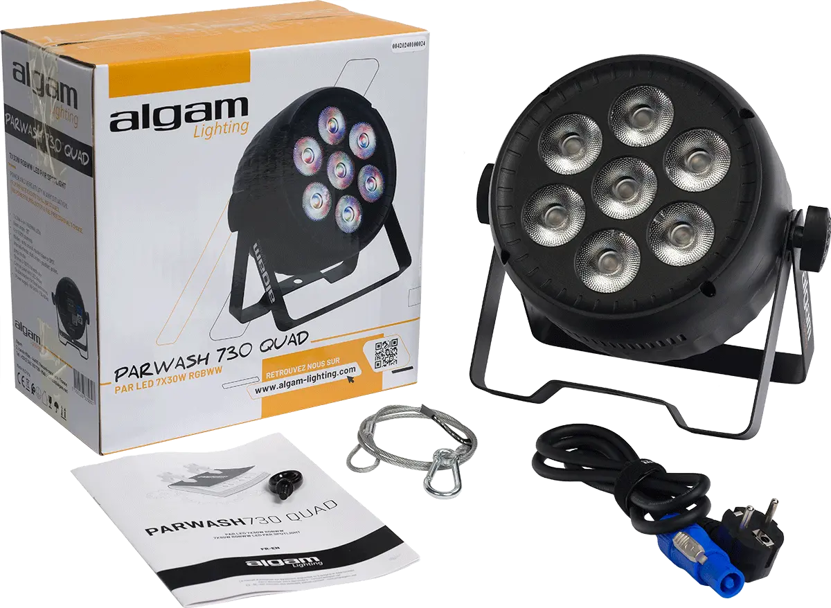 The PARWASH 730 QUAD developed by Algam Lighting is a must-have for any event or light show. This LED PAR is capable of generating a powerful light flow thanks to its 7 X 30W LEDs combined with 25° aperture optics, while generating rich, vibrant colors with its RGB+WW (Warm White) color palette. Ideal for a wide range of applications, the PARWASH 730 QUAD features professional connectivity with 3-point DMX input/output for precise control of the machine and chaining with another PARWASH 730 QUAD. To ensure safe operation, this Par Wash is equipped with a PowerCon locking electrical connector to prevent unintentional disconnection, plus a PowerCon output for powering another PARWASH 730 QUAD. This high-performance machine is actively cooled to guarantee optimal operating conditions, whether on the floor or hanging from a double bracket.