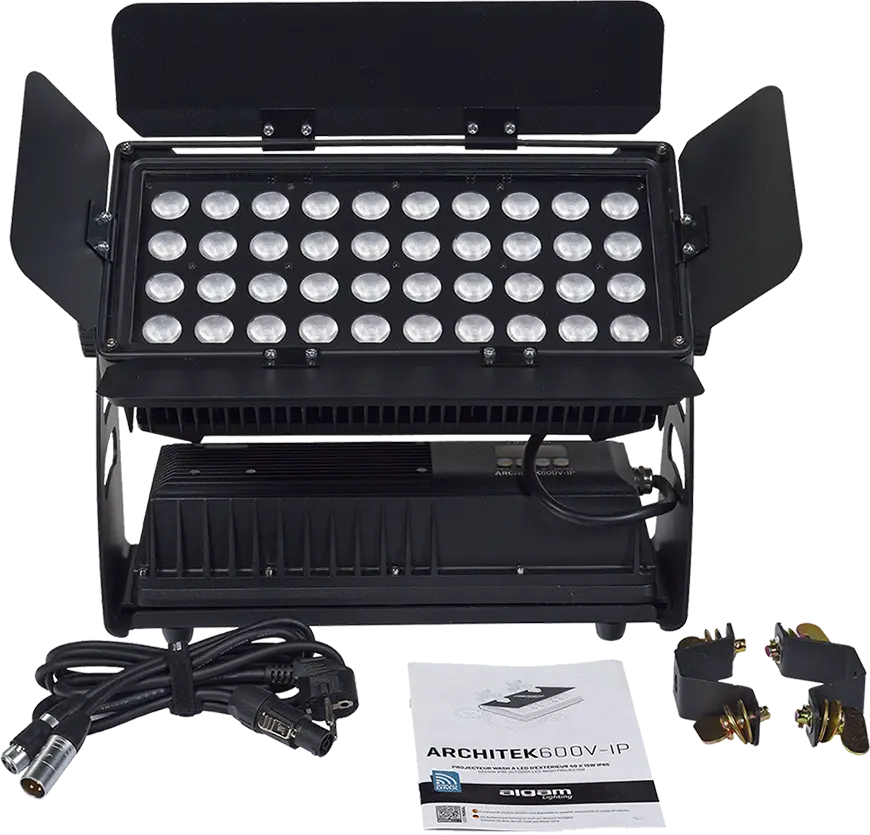The FL600 V-IP is first and foremost an LED spotlight designed for architectural lighting applications such as monuments, castles and theaters, where large surfaces need to be covered. The 40 x 15W RGBW LEDs are perfect for this application, generating a powerful, brilliantly colored beam of light that can be precisely aimed thanks to the tilting cradle and 4 metal shutters for precise control of the beam angle. Perfectly protected from the elements and dust thanks to its IP65 rating, the ARCHITEK 600 V-IP is capable of providing lighting in all circumstances.