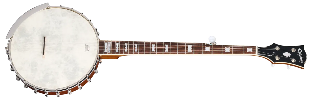 The Epiphone Mastertone Bowie Open Back Banjo was inspired by Gibson ™ Mastertone models with "Bowtie" cosmetics from the 1950s and 1960s and delivers high-quality with vintage style at an accessible price point. Perfect for clawhammer/frailing as well as Scruggs style players, it is equipped with a 26.4" scale length satin-finished mahogany neck that features the Gibson "scroll-style" headstock with mother-of-pearl Epiphone logo and Gibson Crown inlays, the bound laurel fretboard has 22 frets and classic mother-of-pearl Bowie inlays and a Mastertone block inlay at the end of the fretboard. The rim iS layered mahogany with a simple hoop tone ring, and the notched nickel tension hoop and 11" Remo® Fiberskyn® head are held in place with 24 nickel hooks. The Fiberskyn head contributes warm, full-range, vintage-inspired tones with outstanding definition and enhanced mid and low-range resonance. A premium gig bag is also included.