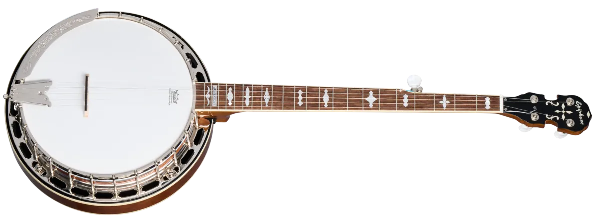 Epiphone has been making banjos since the 1920s, and this Inspired by Gibson Mastertone Classic Banjo model recreates one of the world's most desirable and famous banjos-the classic Gibson RB-3 Mastertone 5-string banjo from the 1930s-at an accessible price. The Epiphone Mastertone Classic Banjo features a mahogany resonator, a 3-ply mahogany rim, and nickel hardware. The 26.4" scale-figured mahogany neck has a laurel fretboard with 22 medium/tall frets and is adorned with Style 3 mother-of-pearl inlays and a Mastertone Block inlay at the end of the fretboard. A hardshell case is also included.