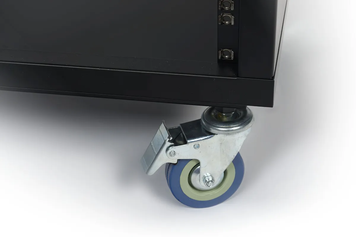This studio rack offers generous space for all your devices, thanks to its universal mounting rails, compatible with the vast majority of 19” equipment. Perforations all over the rack ensure optimum ventilation, while unobstructed access to the front and rear provide easy access to your equipment's wiring and connections. To move all your equipment with ease, the IR-8 is equipped with 4 wheels, 2 of which have locking brakes.