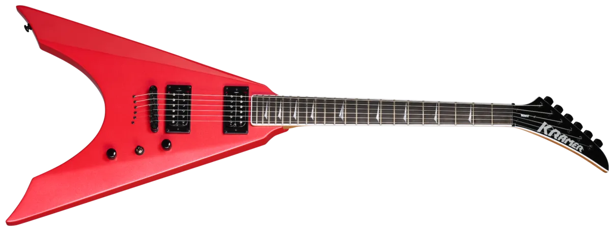 Ever since it was first introduced in 2008, the Kramer Nite-V has been embraced by many notable metal players, including Charlie Parra, Prika Amaral (Nervosa), and The Jasons. The Kramer Nite-V is the ultimate shredder's V, and its distinctive body carve makes it a very comfortable model to play when standing. The latest version of this manic metal machine features a mahogany body with string-through-body construction, a 14-degree angled headstock, locking tuners, a Graph Tech® nut, a thermally-aged maple neck with a K-Speed SlimTaper™ C-shaped profile outfitted with a bound ebony fretboard with Thorn inlays and jumbo frets, and a pair of Kramer USA-made Eruption pickups. A premium gig bag is also included. Pick one up today and rule the stage all Nite long!