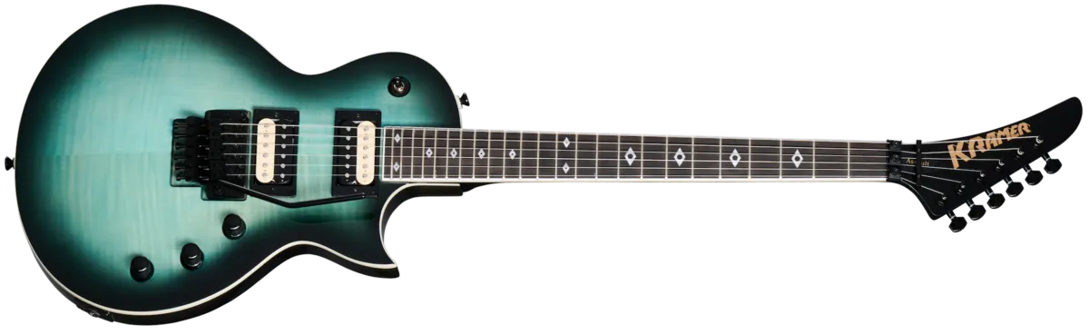 The Kramer Assault started life as the Kramer Custom when it was first released in 2000_ A modern take on the Les PaulTU , it has since become a popular model for hard rock and metal players Who want a lighter and sleeker single cutaway guitar. This newly updated version features a new three-piece thermally-aged maple neck With a satin-finished back. K-Speed SlimTaperrv C profile, and 25.5" scale Iength, while the ebony fretboard is equipped With 24 jumbo frets and decked out With Classic Kramer Diamond Eye inlays_ The body is capped With a AAA flame maple veneer and is packing a pair of Kramer USA Eruption humbucker'V pickups for full-throttled tone and Plenty of attitude. They're wired to individual volume controls and a master tone Control. all of which use CTS@ potentiometers. Of Course, we also included a Floyd Rose@ 1000 series tremolo and R2 locking nut so yOu can divo-bomb any audience into Submission at Will and a premium gig bag to help keep it safe when you're headed out to blow everyone away at your next gig.