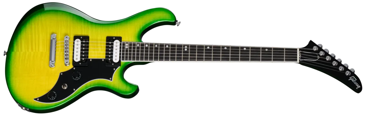 The new Gibson Victory Figured Top was created in response to Player requests for the return of this 80s-era cult favorite. Crafted for limitless self-expression. it carries the DNA of the original versions With enhanced features such as refined body contours. improved weight and balance, and an Explorer TU headstock. The Victory Figured Top has a 25.5" scale Iength, and the mahogany neck has an ebony fretboard With a compound radius for enhanced playability. a SlimTaperTM profile and 24 medium jumbo frets. The mahogany body has an AA figured maple cap. a Tune.O.MaticTU bridge. a Stop Bar tailpiece, and a gloss nitrocellulose lacquer finish, The highly flexible electronics include two 80s Tribute humbucker"•' pickups wired to push/pull master volume and tone controls for coil splitting and inner/outer coil selection 'Rhen the coils are split, which. along With the three-way pickup selector switch. deliver a Wide range Of humbucking and single coil tonal options With a minimum amount of controls. A Gibson hardshell case is also included.