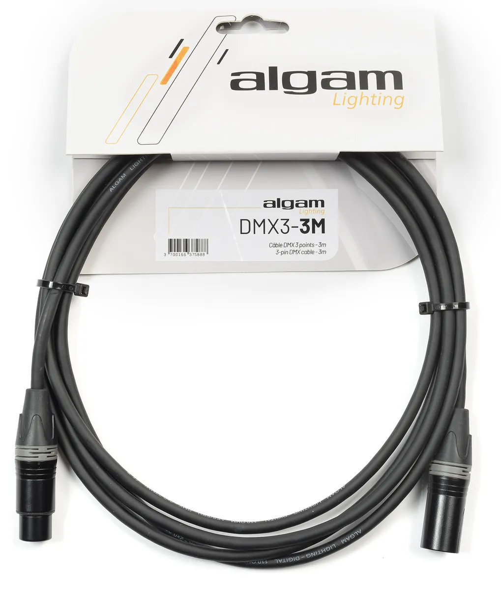 This 3 m 3-pin DMX cable developed by Algam Lighting is the ideal solution for connecting your DMX console to your lighting machines, or for creating chains between spaced systems on a stage or light rig. Robust and reliable, it guarantees optimum DMX signal transmission thanks to its 110Ω impedance, while its 3-point connection makes it ideal for both amateur and advanced lighting systems.