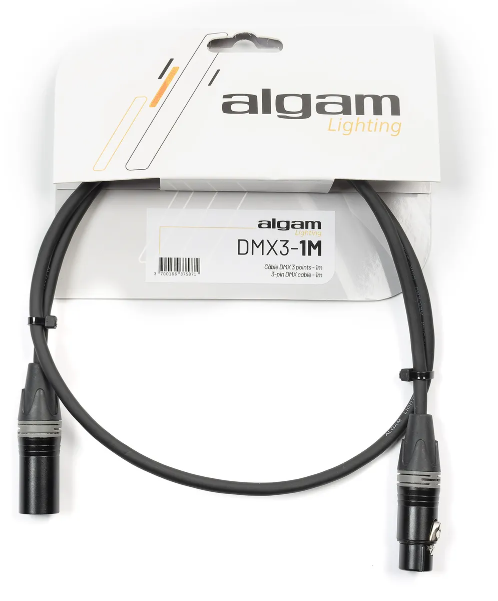 This 1 m, 3-point DMX cable developed by Algam Lighting is the ideal solution for interconnecting your lighting machines, and making clean, discreet chains between systems installed on a stand or structure. Robust and reliable, it guarantees optimum DMX signal transmission thanks to its 110Ω impedance, while its 3-point connection makes it ideal for both amateur and advanced lighting systems.Control your DMX lighting systems with confidenceWould you like to control your DMX-interfaced lights with precision and put on your own light shows? This 3-pin DMX cable is an indispensable link between your DMX console and your lighting systems. Featuring 3-pin connectors suitable for most amateur and professional lighting systems, this robust and affordable 1 m long DMX cable is perfect for connecting your lighting machines to a light bridge or stand.Precise specificationsDesigned to meet the precise characteristics required by the DMX protocol, this DMX cable offers a characteristic impedance of 110Ω via two 0.22 mm² conductors, enabling reliable and efficient DMX signal transmission in professional lighting installations.