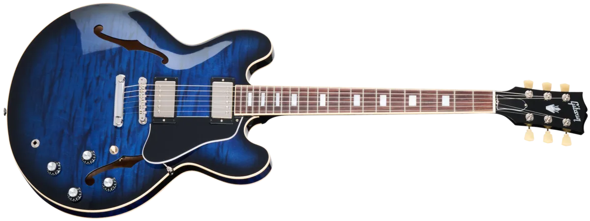 The Gibson ES-335 Figured is the perfect blend of form and function. Crafted with a maple centerblock and quarter-sawn Adirondack spruce bracing, players will be impressed by the lightweight feel and expanded range of tonal capabilities. Equipped with high-end appointments like our hand-wired control assembly with Orange Drop® capacitors, Gibson's new Calibrated T-Type humbucking pickups, Vintage Deluxe style tuners, and lightweight aluminum ABR-1 bridge and Stop Bar tailpiece anchored with steel thumbwheels and studs. The AAA figured maple is set off by beautiful Custom Color Series gloss finishes including Blood Moon Burst, Deep Ocean Burst, and Honey Amber.