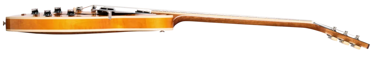 The Gibson ES-335 Figured is the perfect blend of form and function. Crafted with a maple centerblock and quarter-sawn Adirondack spruce bracing, players will be impressed by the lightweight feel and expanded range of tonal capabilities. Equipped with high-end appointments like our hand-wired control assembly with Orange Drop® capacitors, Gibson's new Calibrated T-Type humbucking pickups, Vintage Deluxe style tuners, and lightweight aluminum ABR-1 bridge and Stop Bar tailpiece anchored with steel thumbwheels and studs. The AAA figured maple is set off by beautiful Custom Color Series gloss finishes including Blood Moon Burst, Deep Ocean Burst, and Honey Amber.
