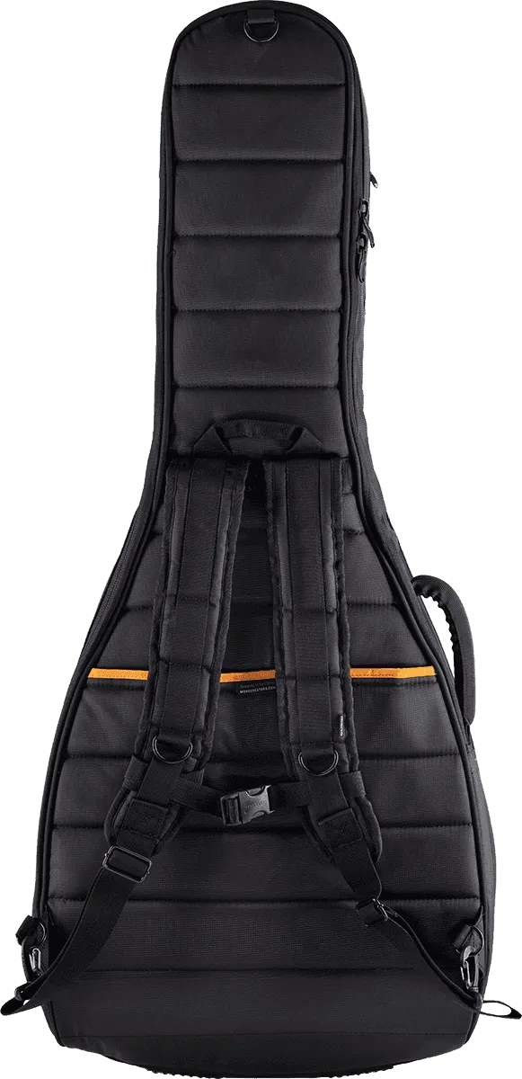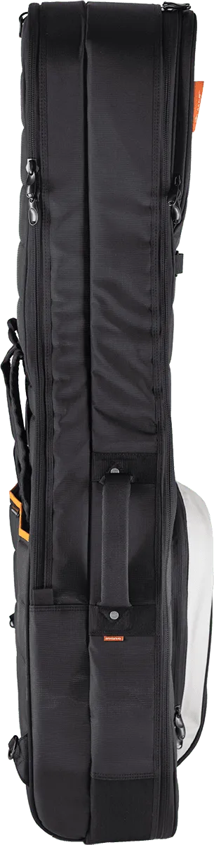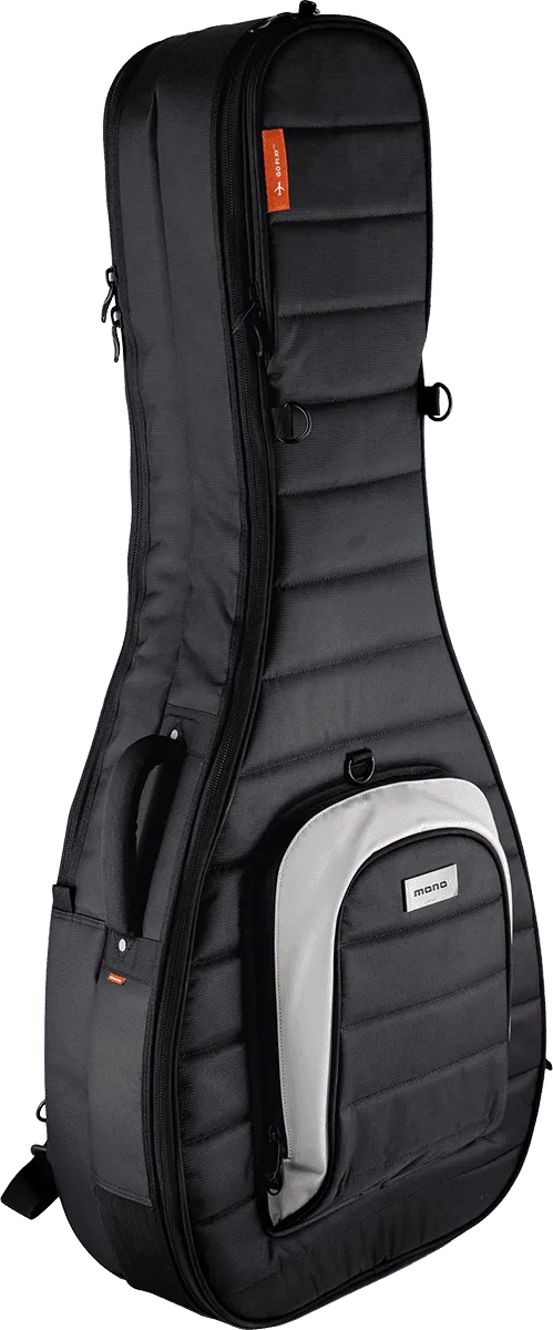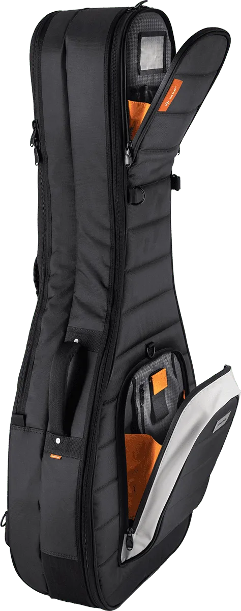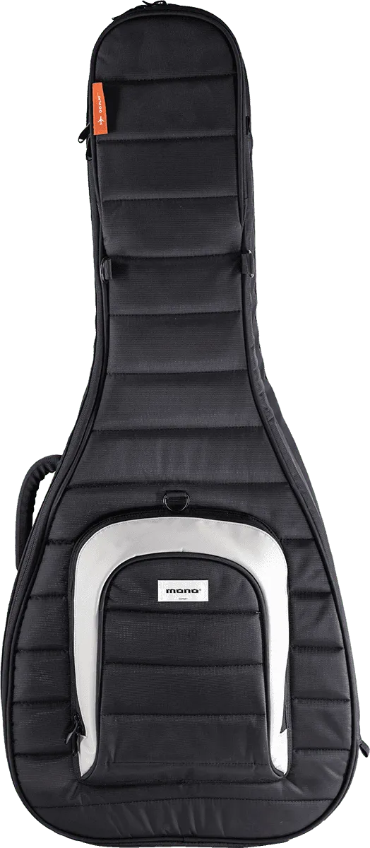 Now it is finally possible to carry one solid body electric and one semi hollow body guitar at the same time, both fully protected with MONO’s patented Headlock™ neck suspension system. The acoustic side will also accommodate most archtops and semi-hollows. The first of its kind. Go play. 360° PROTECTION DROP-PROOF The patented Headlock™ design provides a level of protection worthy of the finest instruments. Your guitars quickly strap in and remains stabilized during transport. Both headstocks are suspended inside the case, saving your guitars from both side and rear impacts that could otherwise snap the necks. STRAP PIN PROTECTION & IMPACT DEFLECTION Hi-density foam bumpers divert vertical impacts out and around the case, away from the strap pin. Integral ABS panels deliver hardcase protection at a fraction of the weight. The reinforced outer shell of the M80 hybrid case absorbs and deflects hard impact away from the vulnerable areas of the guitar. SMART STORAGE ONE OR TWO GUITARS The design of the Classic Dual Acoustic/Electric Guitar Case creates a completely separate case for each guitar. Load your dreadnought, archtop or semi-hollow guitar in first. The electric guitar slides into its own slim, Sleeve-like compartment. Both are protected with our Headlock™ suspension system and strap pin bumpers. Both are always easily accessible and the case can be used with one or two guitars. PLUG AND PLAY Everything in its place. Specialized storage compartments put your gear right where you need it. The hidden upper pocket keeps your wallet, keys, and cell concealed. Pen slots double as tool storage. Business card storage and a durable key clip are also included. BUILT TO LAST WEAR IT OUT We build our cases to military specs, using only high-test materials with extreme resistance to abrasion and the elements. Inside, the plush lining protects delicate custom finishes. Outside, the water-resistant Sharkskin™ shell keeps you on the move, rain or shine. 100% animal free. RIVETED HANDLE & HYPALON SOLE Rock solid, industrial webbing handles come standard on MONO cases. Bar-tack stitching and steel rivets reinforce for strength, while high grade webbing provides a super comfortable grip. All M80 cases feature a hard-wearing sole and piping made of Hypalon - the same industrial rubber used to create inflatable military rafts. This sole simply does not wear out. DIMENSIONS & FITTING LIKE A GLOVE These measurements represent the inner capacity of the case. If you are unsure about the fit for your guitar, make sure it does not exceed any of the maximum dimensions shown just to be safe. This case is designed to fit one standard body electric guitar including Fenders like Teles, Strats, Jaguars and Jazzmasters, Gibsons like Les Pauls and SGs, Ibanez, ESP and many others. The Acoustic side is suitable for dreadnoughts and dreadnought-sized guitars as well as archtop and semi-hollow guitars. Weight: 140 oz (8.75 lbs)